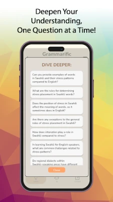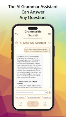 Ili kukamilisha uzoefu wako wa kujifunza, programu yetu inatoa usaidizi wa papo hapo kupitia Chatbot ya AI, iliyepo kujibu maswali yako yote ya sarufi ya Kiswahili kwa ufafanuzi wa kina. Zaidi ya hayo, kipengele cha Kurekebisha Sentensi kinakuwezesha kuandika sentensi zako na kupokea masahihisho ya papo hapo pamoja na maelezo, ikikusaidia kufikia usahihi wa lugha. Ili kuhakikisha unazungumza kama mzawa, programu imejumuisha vipengele vya sauti kwa ajili ya mazoezi ya matamshi. Kwa wale wanaotafuta kuimarisha zaidi ujuzi wao, "Grammarific Swahili" inatoa uwezo wa ziada kama maswali ya kina ya 'Dive Deeper', usaidizi wa Chatbot wa wakati halisi, na uchanganuzi wa kina wa Kurekebisha Sentensi, vyote vikilenga kuboresha safari yako ya kielimu na kukufanya uwe bingwa wa Kiswahili.