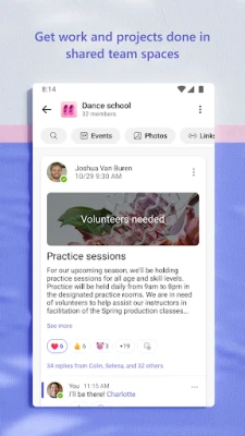 Jenga mazingira ya kazi ya pamoja yenye tija ambapo mazungumzo yanapangwa kwa mada na miradi mahususi kupitia timu na chaneli. Unda jumuiya maalum kujadili mada fulani na kupanga mipango kwa urahisi. Shiriki picha na video papo hapo katika gumzo ili kusambaza matukio muhimu au taarifa kwa haraka. Tumia hifadhi ya wingu kufikia nyaraka na faili zilizoshirikiwa ukiwa popote, na uhakikishe maudhui yaliyoshirikiwa – matukio, picha, viungo, faili – yanapangwa vizuri ndani ya jumuiya yako ili usipoteze muda kutafuta.