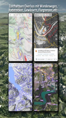 Mbali na utajiri wa ramani za Uswisi, programu inatoa tabaka 13 za ramani zenye chanjo duniani kote, ikiwemo OpenStreetMap (OSM) katika mitindo mbalimbali, na viwekezo vingi kama vile njia za kupanda milima, njia za baiskeli, na mtandao wa maji. Kipengele muhimu ni uwezo wa kupakua ramani na picha za angani bila malipo kwa maeneo maalum, kuhakikisha urambazaji usio na mshono hata bila muunganisho wa intaneti. Programu hii inakuruhusu kulinganisha ramani mbalimbali kama tabaka na kurekebisha uwazi wao, kukupa uhuru wa kuchagua ramani inayofaa zaidi kwa safari yako. Kazi muhimu za urambazaji ni pamoja na kuunda na kuhariri vitambulisho, urambazaji wa GoTo, kupima njia na maeneo, Tripmaster yenye data kama kilomita za kila siku na kasi ya wastani, utafutaji wa maeneo, na kushiriki njia au vitambulisho.